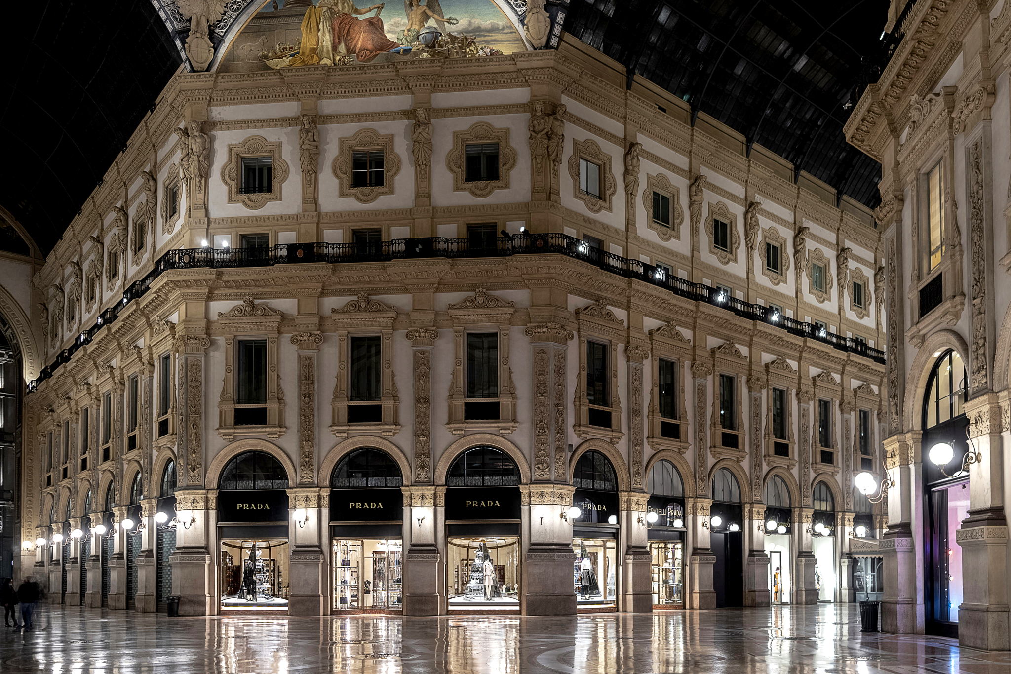 Localizada en la prestigiosa Galleria Vittorio Emanuele II, Prada era una exclusiva y elegante tienda de equipaje, accesorios y productos de lujo hechos con materiales finos y de manufactura refinada.